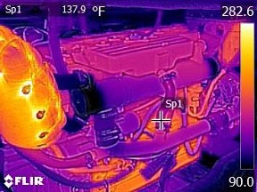 The image is of a Cummins diesel marine engine while being run during a sea trial. The image on the left is a standard thermal image whereas the image on the right is a Thermal MSX® Image.